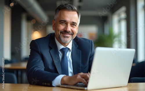 Portrait of mature European Latin business man ceo trader using laptop computer online, working in modern office. Middle-age Hispanic businessman entrepreneur wearing suit smiling at camera at table