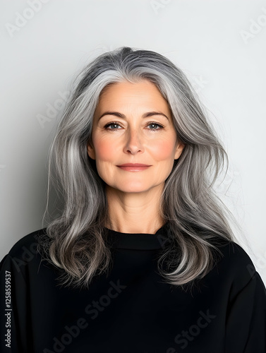 Portrait of mature woman with gray hair smiling at camera against plain white background, for beauty concepts