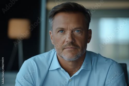 Portrait of middle age handsome Caucasian businessman in business casual dress, copy space
