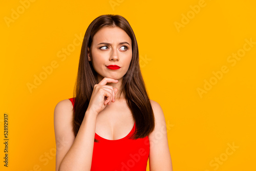 Portrait of minded pretty person arm touch chin look empty space hesitate brainstorm isolated on yellow color background