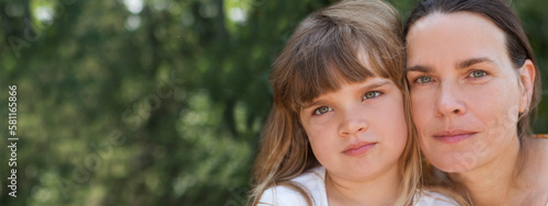 portrait of mother and little daughter in nature on a summer day. Happy family. banner