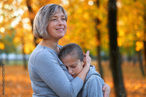 Portrait of mother with her sad daughter in autumn city park. Bright yellow trees and leaves