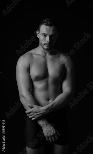 Portrait of muscular young bodybuilder on dark background, black and white effect