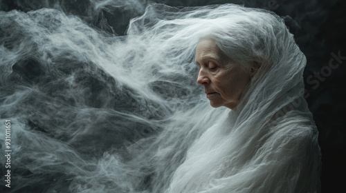 Portrait of Old Woman in White Costume on Black Background