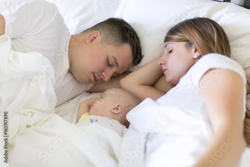 Portrait of parent with her 3 month old baby in bedroom sleeping