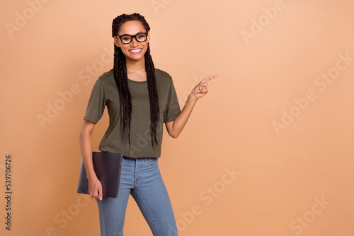Portrait of positive charming lady hold netbook indicate finger empty space feedback isolated on beige color background