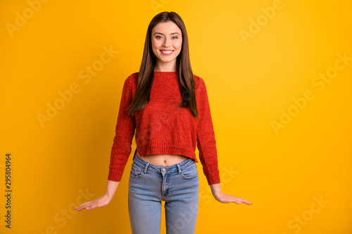Portrait of positive cheerful girl have fun enjoy her free time with friends look stare feel content candid emotions wear red pullover sweater isolated over yellow color background