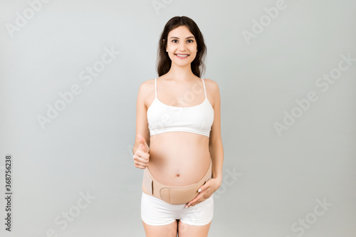 Portrait of pregnant woman in underwear wearing maternity belt on her belly and showing thumb up gesture at gray background. Orthopedic abdominal support belt concept. Copy space