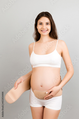 Portrait of pregnant woman in white underwear dressing maternity belt at gray background with copy space. Support belt against backache. Orthopedic abdominal support belt concept