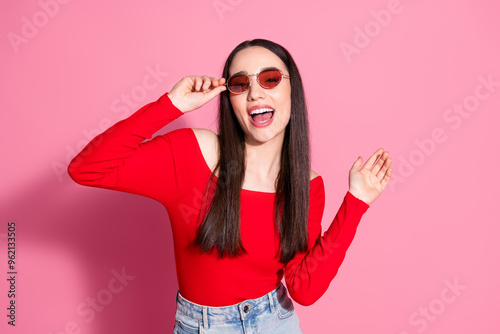 Portrait of pretty young girl touch sunglass dance red top isolated on pink color background