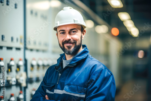 Portrait of proud smiling electrical engineer with hard hat in front of control panel of power plant
