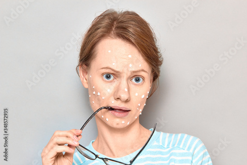 Portrait of puzzled girl with white drops of face cream on skin