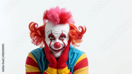Portrait of sad clown looking at camera isolated on white background. Circus clown close up