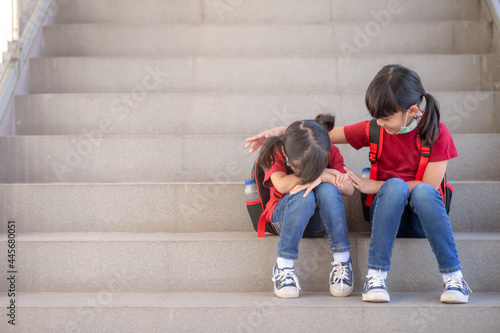 Portrait of schoolgirl crying while sitting on stairs outdoors with smiling sister comforting her, copy space