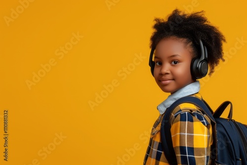 Portrait of schoolgirl enjoying music with headphones and backpack, ready for school, on a vibrant yellow background with copyspace for text