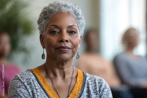 Portrait of senior black woman sitting in circle at mental health support group in retirement home, Generative AI