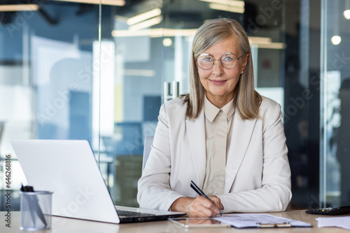 Portrait of senior mature female financier at workplace, gray haired businesswoman smiling and looking at camera doing paperwork, boss in business suit using laptop inside office.