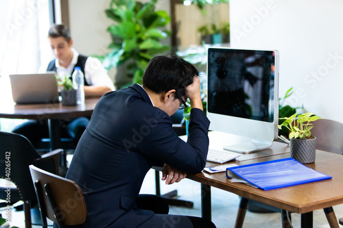Portrait of serious and pensive Asian business people working with desktop computer at coworking space. sad man concept
