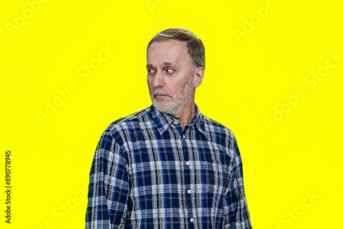 Portrait of serious caucasian man is looking back. Isolated on yellow.