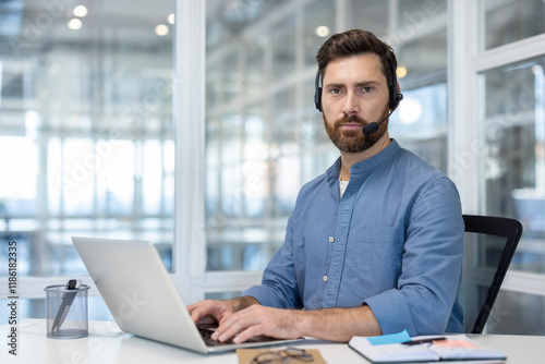 Portrait of serious confident man inside office with headset phone. Support worker looking at camera using laptop for video call. Customer service consulting online remotely.