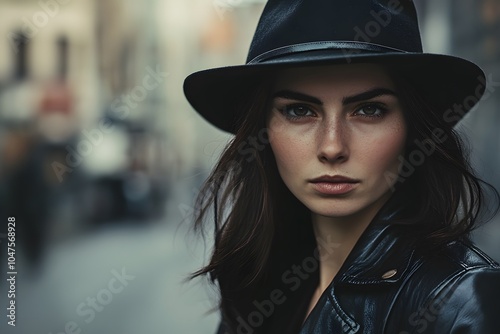 portrait of serious, mysterious, confident and stylish woman wearing black hat in a leather jacket