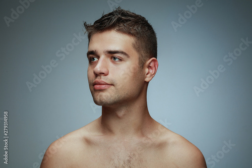 Portrait of shirtless young man isolated on grey studio background. Caucasian healthy male model looking at side and posing. Concept of men's health and beauty, self-care, body and skin care.