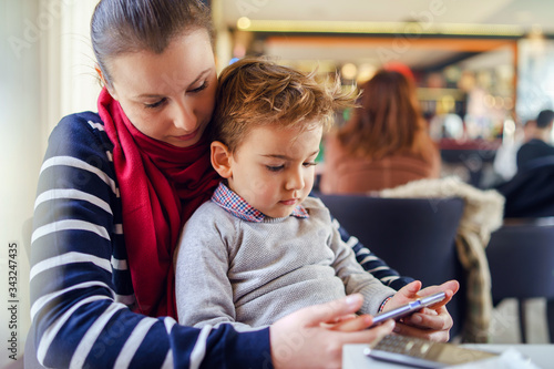 Portrait of small caucasian boy little child sitting in lap of his mother female woman by the table at home or cafe restaurant in day side view mobile smart phone playing games learning teaching app