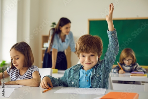 Portrait of smart clever primary school student sitting at desk in classroom raising hand smiling to camera. Pick me gesture. Positive children emotion. Back to school and education concept
