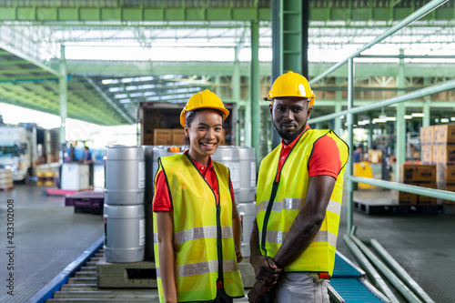 Portrait of Smiling African American worker looking camera in the Industry warehouse. Black female and male laborer in safety vest, hard hat working in a factory. Concept of Industrial manufacturing