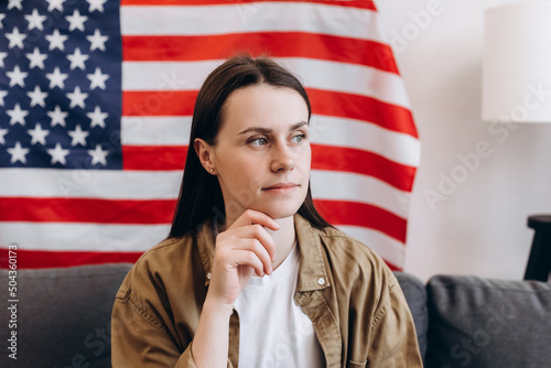 Portrait of smiling american young brunette woman sitting on comfy couch at home on background USA flag. Calm free gen z hipster girl 20s old year celebrating freedom on Independence Day concept