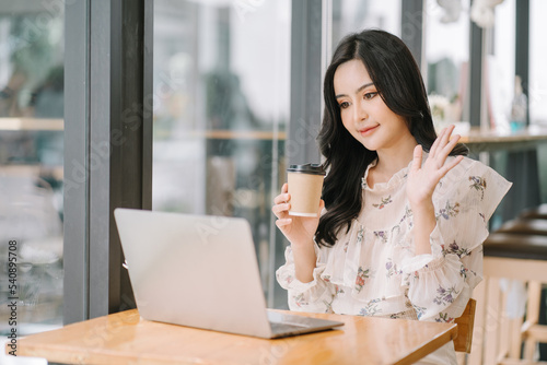 Portrait of smiling beautiful business asian woman working in modern office desk using tablet laptop computer, Business people employee freelance online marketing e-commerce telemarketing concept.