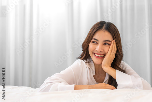 Portrait of smiling beautiful pretty asian woman clean fresh healthy white skin posing smile in pajamas white clothes, skincare, lady, model, cosmetic, fashion.Girl relax, enjoy at home.asia beauty