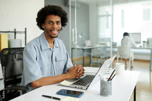 Portrait of smiling Black project manager working on laptop in office