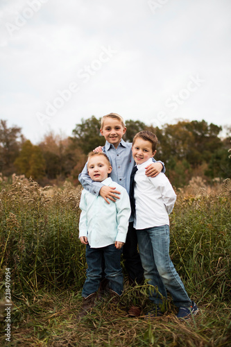 Portrait of smiling brothers standing on grassy field against clear sky in forest