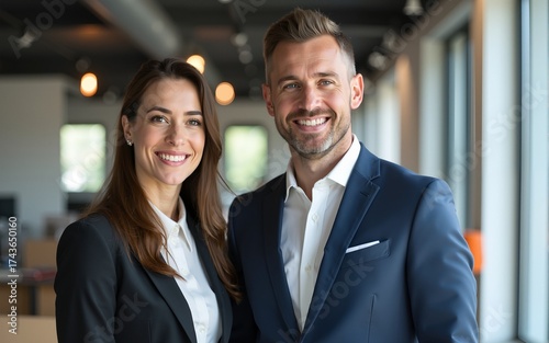 Portrait of smiling business man and woman standing in contemporary office, professional setting. High quality