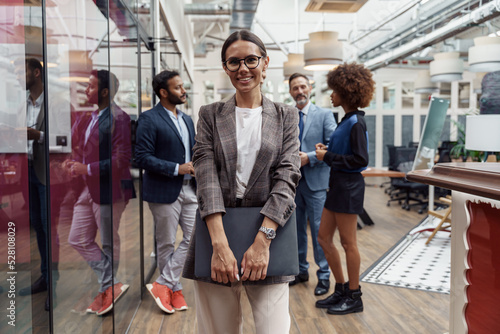 Portrait of smiling businesswoman in glasses standing in modern office on colleagues background