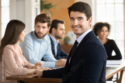 Portrait of smiling Caucasian young businessman look at camera posing at office meeting, happy confident male employee worker show success leadership at briefing, employment, internship concept