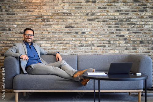 Portrait of smiling handsome manager with eyeglasses sitting comfortably on sofa in modern office