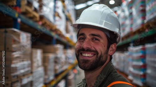 Portrait of Smiling Male Warehouse Worker Wearing Hard Hat in Industrial Setting with Clean Lines and Bright Colors