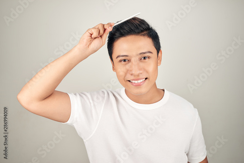 Portrait of smiling man in t-shrit combing his hair.