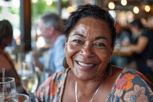 Portrait of smiling mature woman sitting at dining table in restaurant
