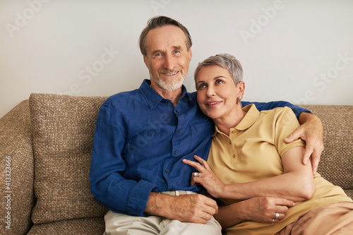 Portrait of smiling senior couple sitting on a couch in a living room. Two positive mature people embracing at home.