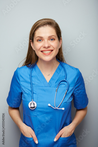 Portrait of smiling woman nurse in blue medical suit. Isolated portrait of female medical worker.
