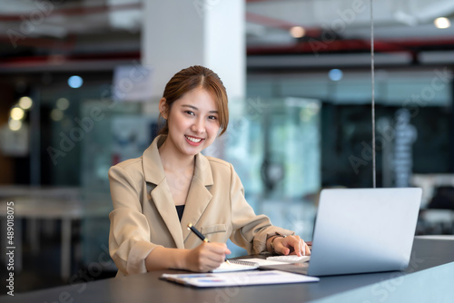 Portrait of smiling young beautiful Asian businesswoman sitting with laptop computer looking at camera in the office.