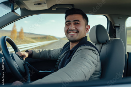 Portrait of smiling young man driving car. behind wheel looking at camera