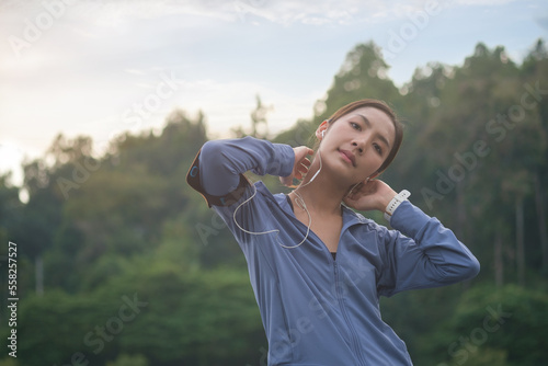 Portrait of sportswoman listening to music with earphone, taking break during jogging outdoors.