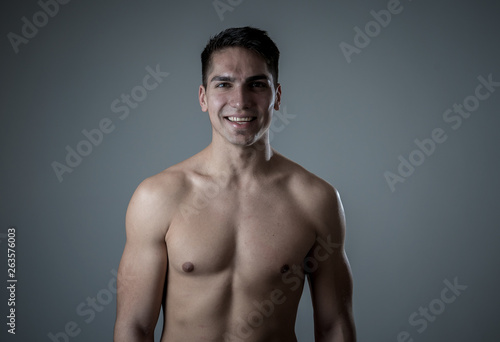 Portrait of strong healthy handsome Athletic man isolated on neutral background