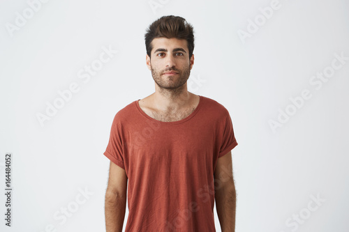 Portrait of stylish bearded guy with trendy haircut wearing casual red T-shirt looking with his brown eyes at the camera. Young handsome man having pleased look. People and emotions concept.