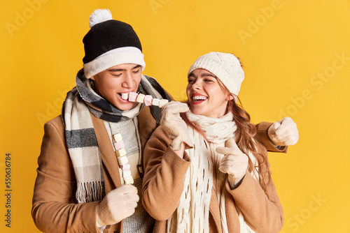 Portrait of stylish young man and woman in cozy winter clothes posing with marshmallow isolated over yellow background