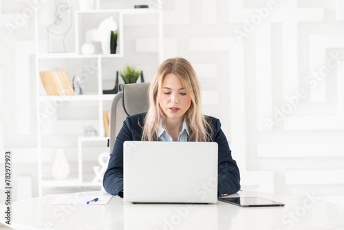 Portrait of successful and attractive business woman working on laptop in her office. Positive female employee in black suit smiling and sitting at the desk in her modern workplace